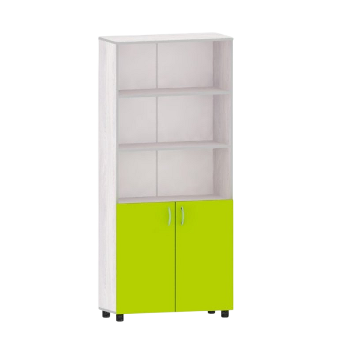 Имеет регулируемые опоры, глухие двери внизу и открытые полки вверху, не менее 2-х в каждой секции, крепежной мебельной фурнитуры, в том числе для крепления к стене, кромки из ПВХ.